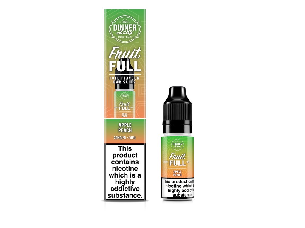 Osviežujúci e-liquid Dinner Lady Apple Peach spája šťavnaté jablko s jemnou broskyňou. Dostupný v balení 10 ml so silou nikotínu 20 mg.