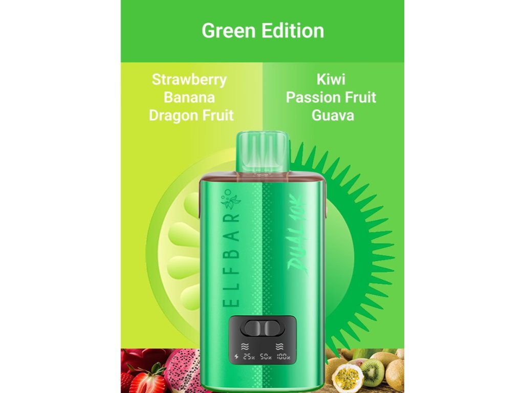 ELFBAR DUAL 10K – GREEN EDITION prináša revolúciu do sveta jednorazových vapov. Vďaka duálnemu systému príchutí môžeš jednoducho prepínať medzi dvoma osviežujúcimi ovocnými chuťami – Kiwi Passionfruit Guava, ktorá kombinuje ostré kiwi, sladkú guavu a tropické passionfruit, a Strawberry Banana Dragonfruit, ktorá spája sladké jahody, krémový banán a exotický dračí ovocie.