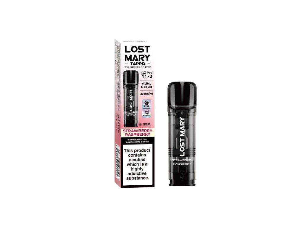 Lost Mary Tappo 2PACK – Strawberry Raspberry je balenie dvoch 2 ml podov, kompatibilných so zariadeniami Lost Mary Tappo, ELFA a ELFA PRO. Každý pod spája sladké jahody a jemne kyslé maliny pre vyvážený ovocný profil. Až 1 200 ťahov a mesh coil technológia.
