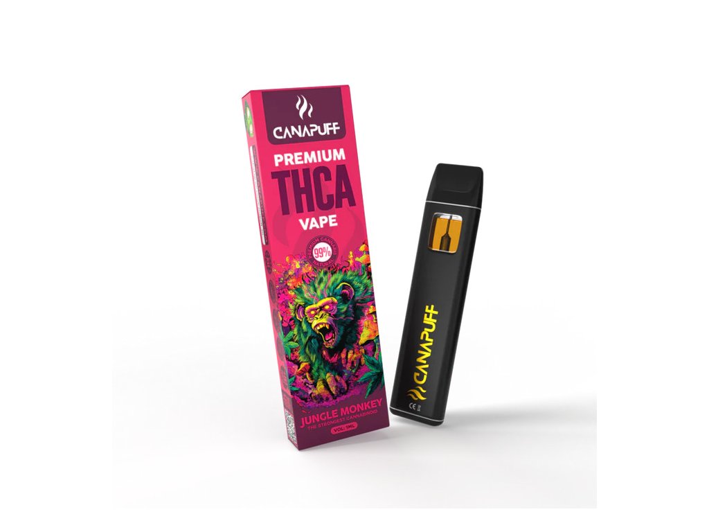 CANAPUFF THCA Jungle Monkey zaujme tematickým dizajnom a kompaktným vyhotovením. Zberateľský predmet s objemom 1 ml, určený výhradne na zberateľské účely.